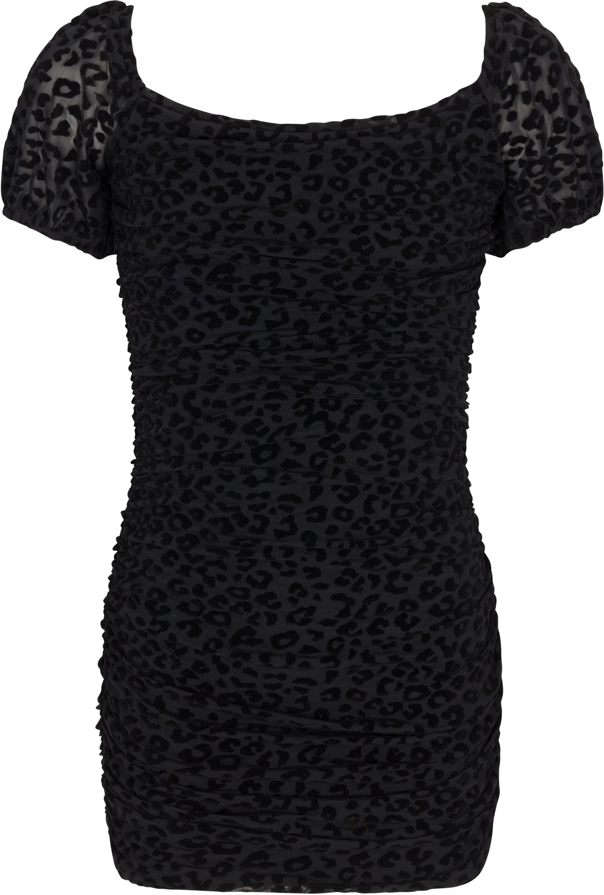 Olivia Dress – Black Leopard Bring the drama in the Olivia Dress in bold black leopard mesh. With all-over ruching for a flattering fit, puff sleeves for a playful twist, and a sleek mini length, this dress is made for the girl who owns the spotlight. This dress runs small. Size up!