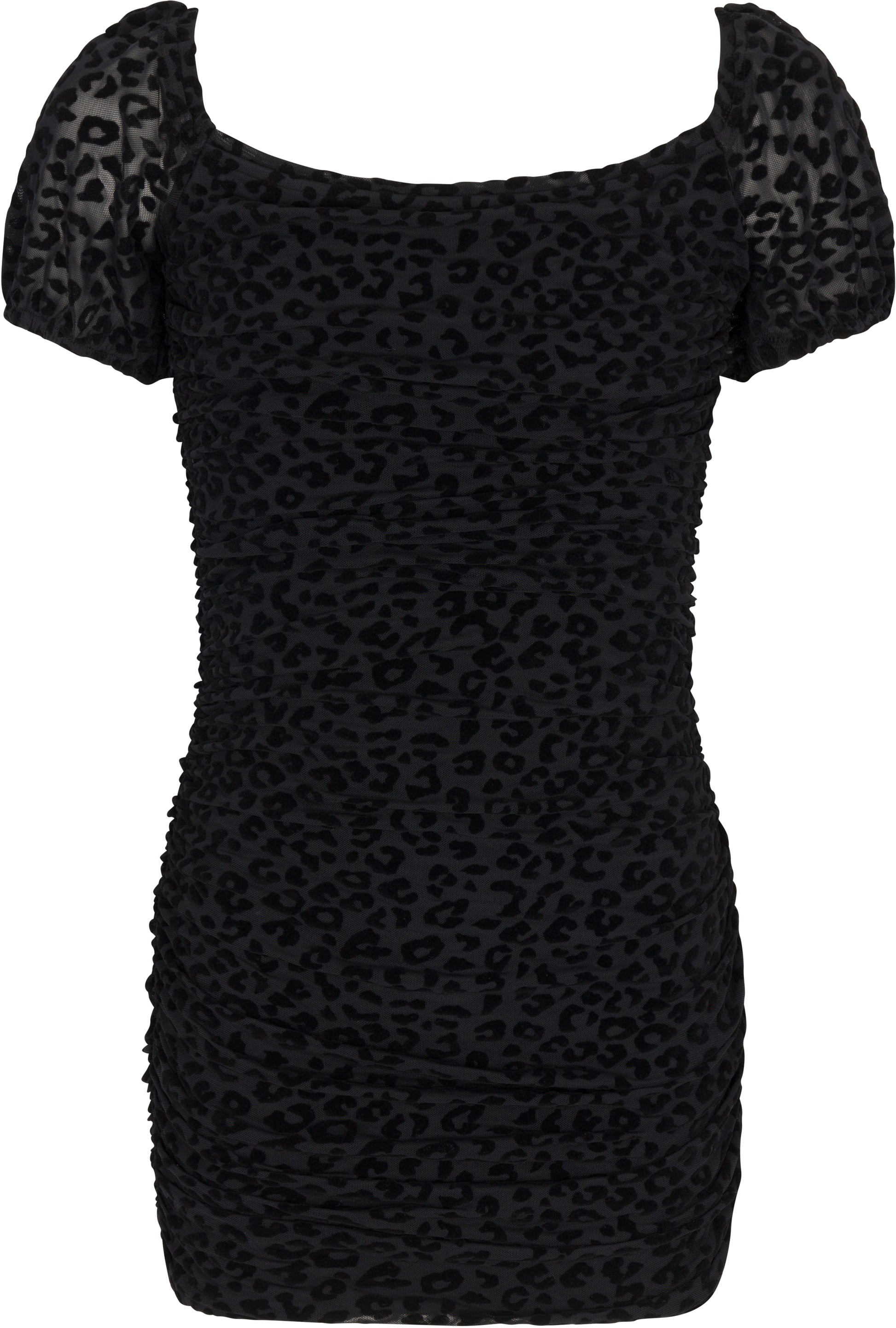 Bring the drama in the Olivia Dress in bold black leopard mesh. With all-over ruching for a flattering fit, puff sleeves for a playful twist, and a sleek mini length, this dress is made for the girl who owns the spotlight. This dress runs small. Size up!